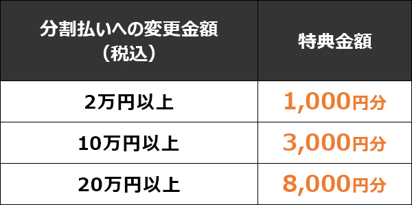 各対象期間ごとの分割払いへ変更された金額に応じて、特典金額が異なります。