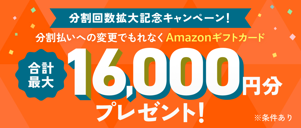 期間1・期間2の両期間で条件を満たすと、最大16,000円分のAmazonギフトカードをプレゼントします。特典金額は、それぞれの期間における分割払いへの変更金額に応じて異なります。