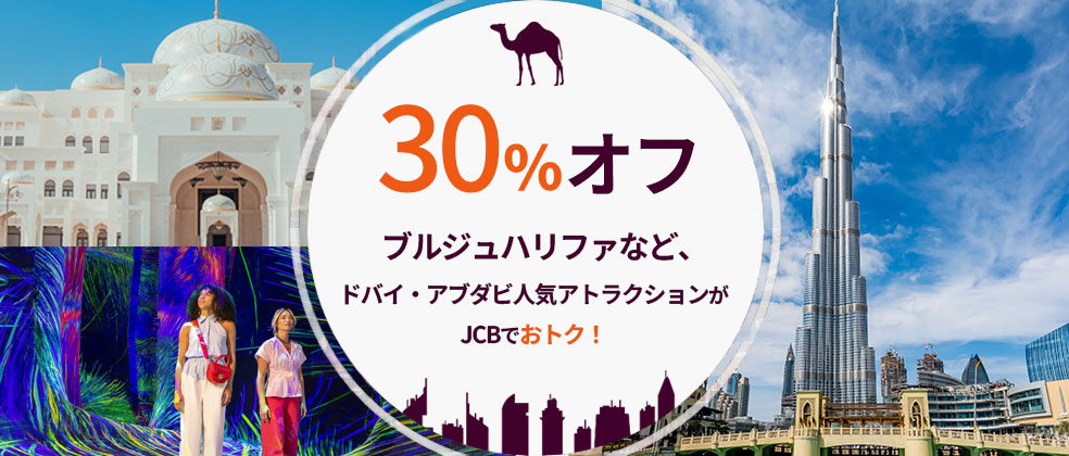ECサイト「alike」で、ドバイの有名観光スポット「ブルジュハリファ(Burj Khalifa)」や今年新しくオープンしたアブダビの「チームラボ・フェノメナ(teamLab Phenomena)」を含む人気アトラクションチケットがJCB会員限定で30%オフ。旅行中に便利なSIMカードも割安で購入できます!