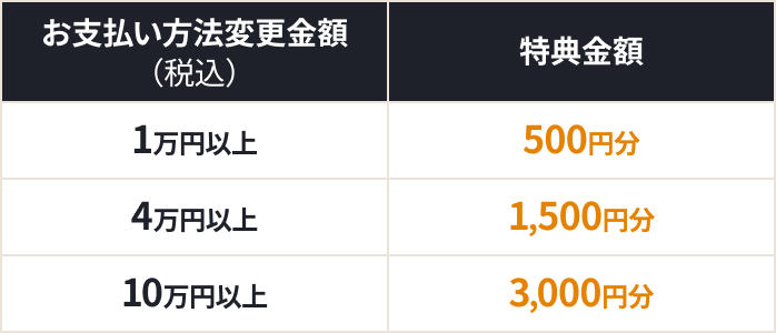 あとからお支払い方法を変更された金額に応じて特典金額が異なります。