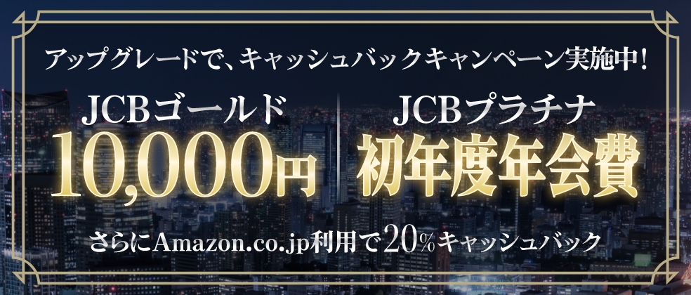 JCBゴールドを合計10万円(税込)以上利用すると、10,000円キャッシュバック。JCBプラチナを20万円(税込)以上利用すると、初年度年会費(27,500円)キャッシュバック。