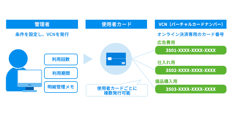 VCNとは、仕入れ、経費など用途に応じてオンライン決済専用のカード番号を即時発行できるサービスです。VCNは、大型法人カードの管理者向けWEBサービス「JCB法人カードステーション」で使用者カードに紐づくバーチャルカードナンバーとして発行できます。VCNごとに利用条件(回数・期間・金額)も設定できます。
