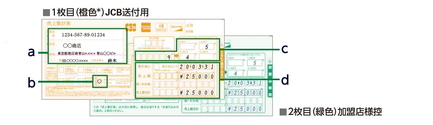 - *「通信販売・催事用 売上集計表」では、1枚目のJCB送付用はピンク色です。