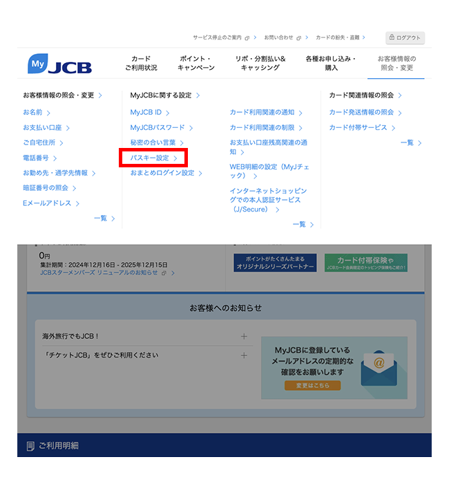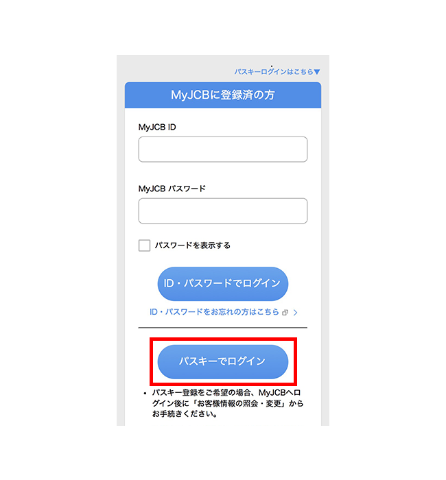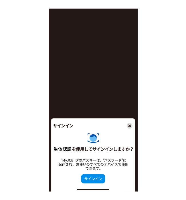 - MyJCB IDはパスキーのログイン時に表示される名称となりますので、変更が必要な場合はパスキー登録前に行ってください。また、パスキー登録中はMyJCB IDの変更はできません。一度パスキーを解除してからMyJCB IDを変更してください。変更後はパスキーの再登録をお願いします。