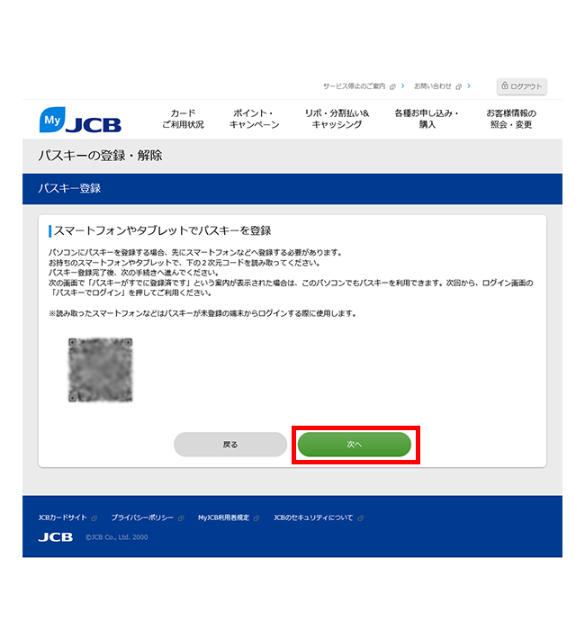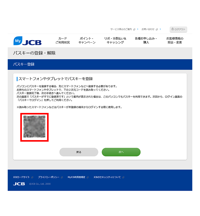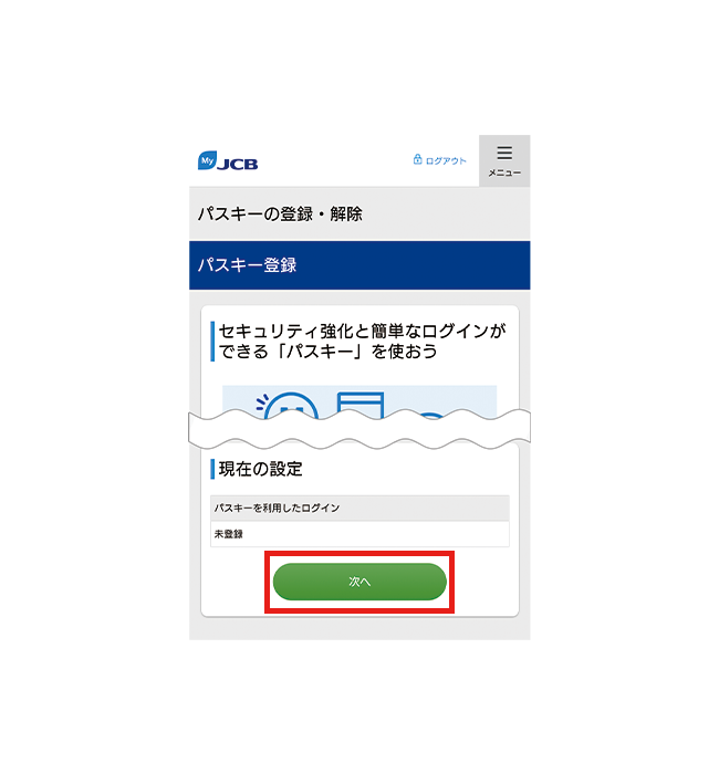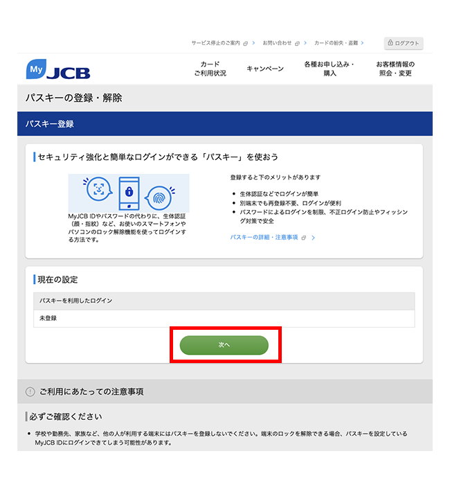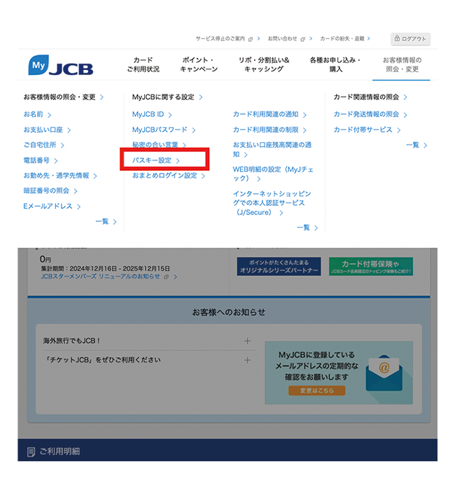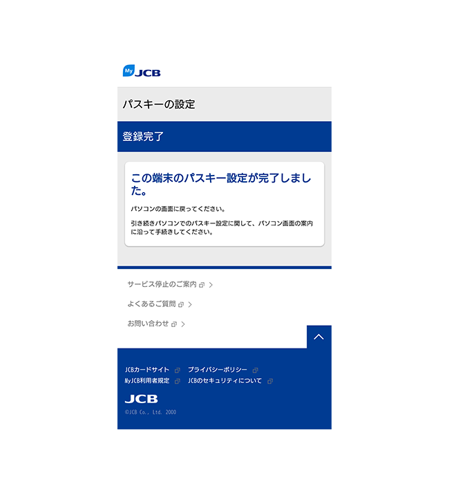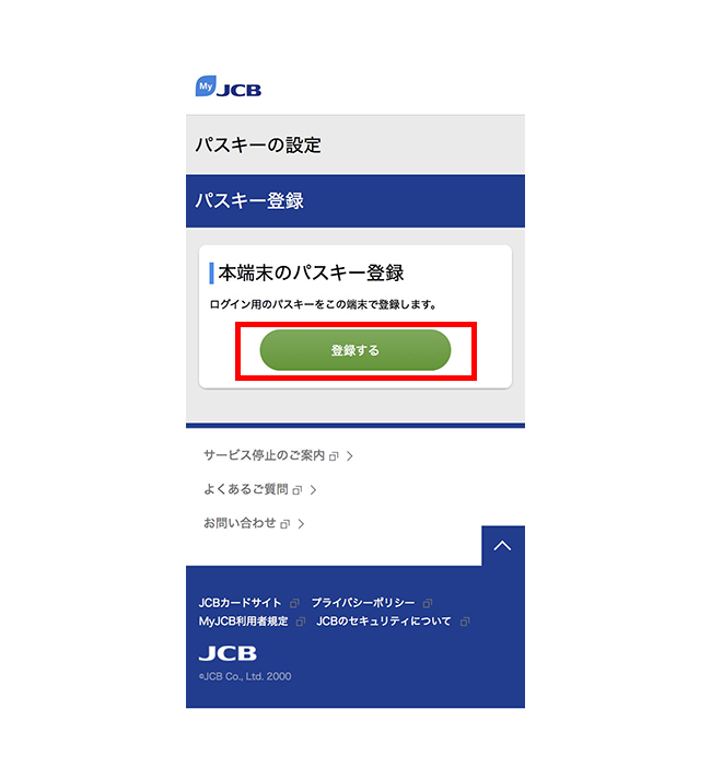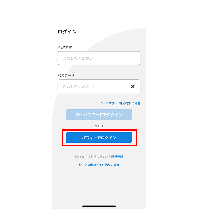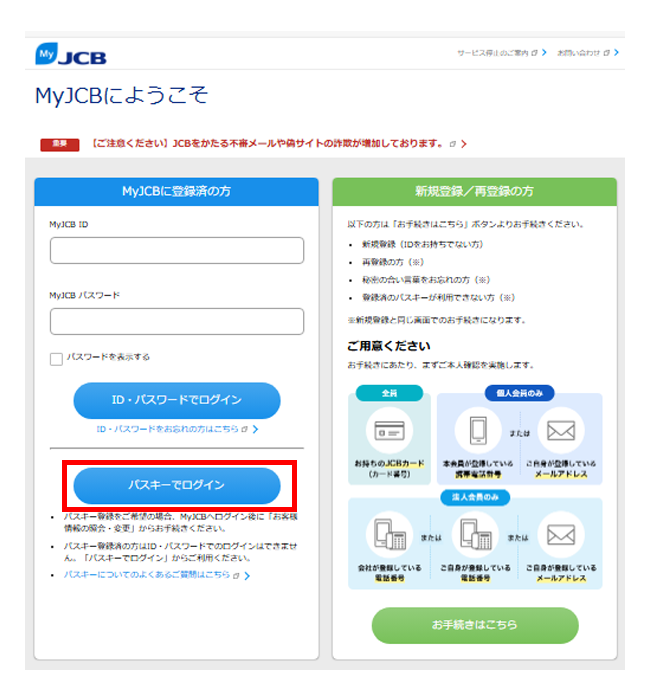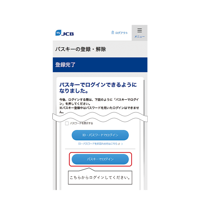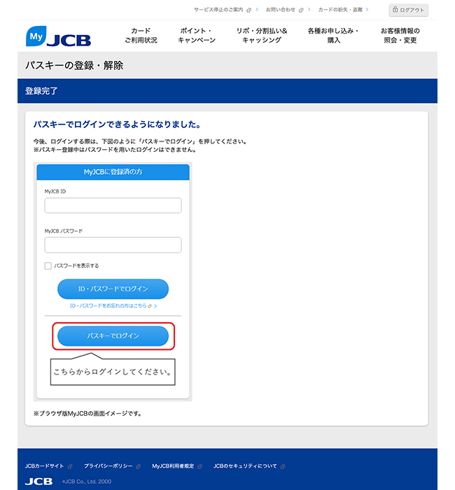 - MyJCBを初めて使う方は、新規登録手続き完了画面にて、ID・パスワードが表示されるページ下部から続けてパスキーの登録ができます。