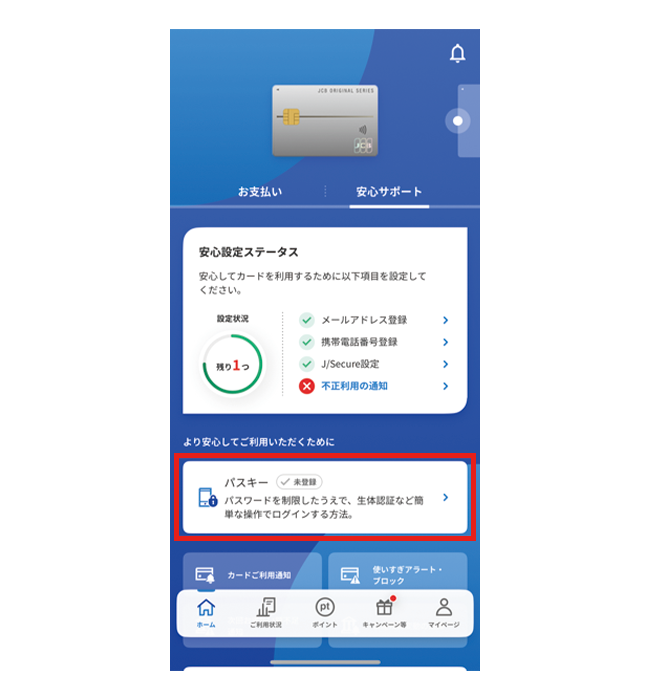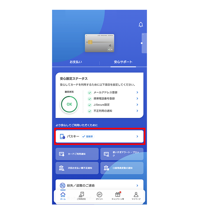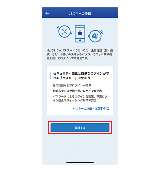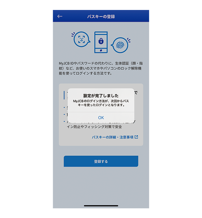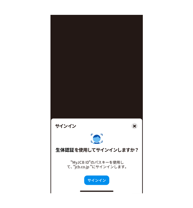 パスキー登録後はパスワードを使わず、生体認証などでMyJCBにログインできます。他者による不正ログインの心配がありません。