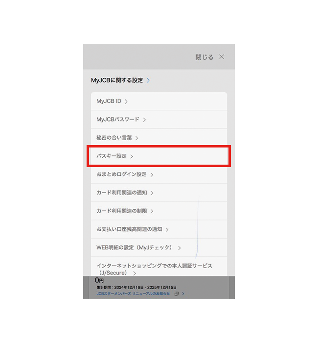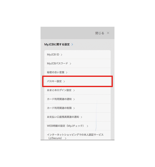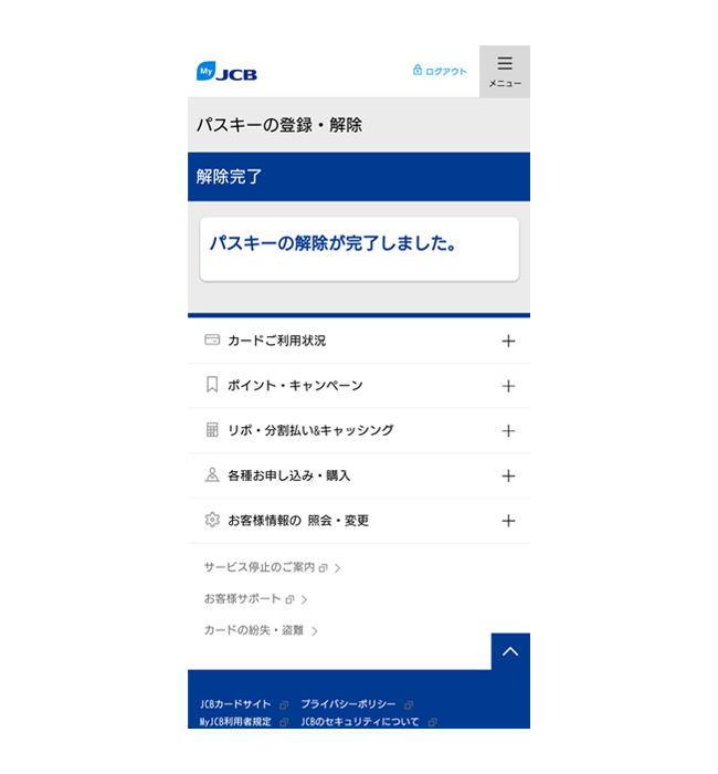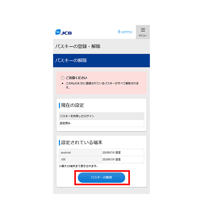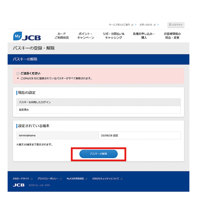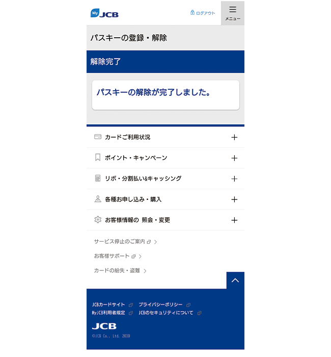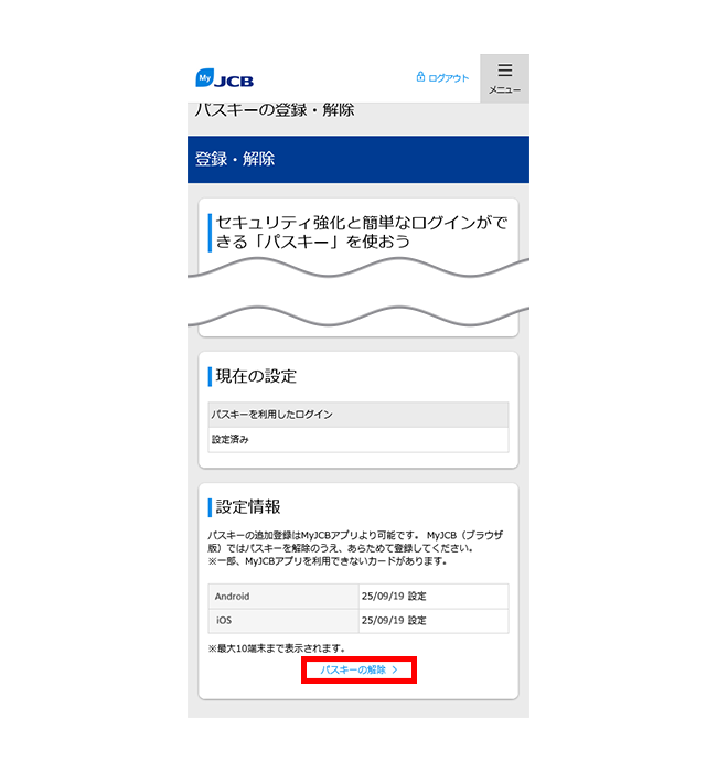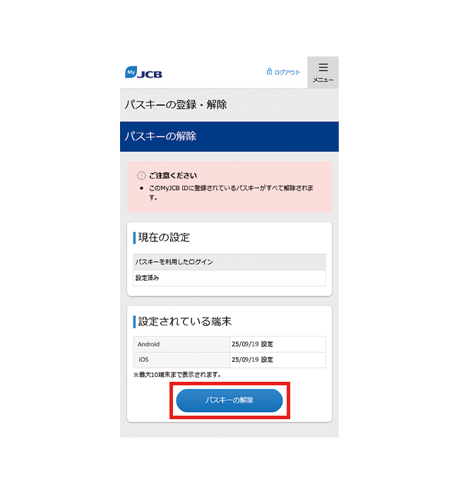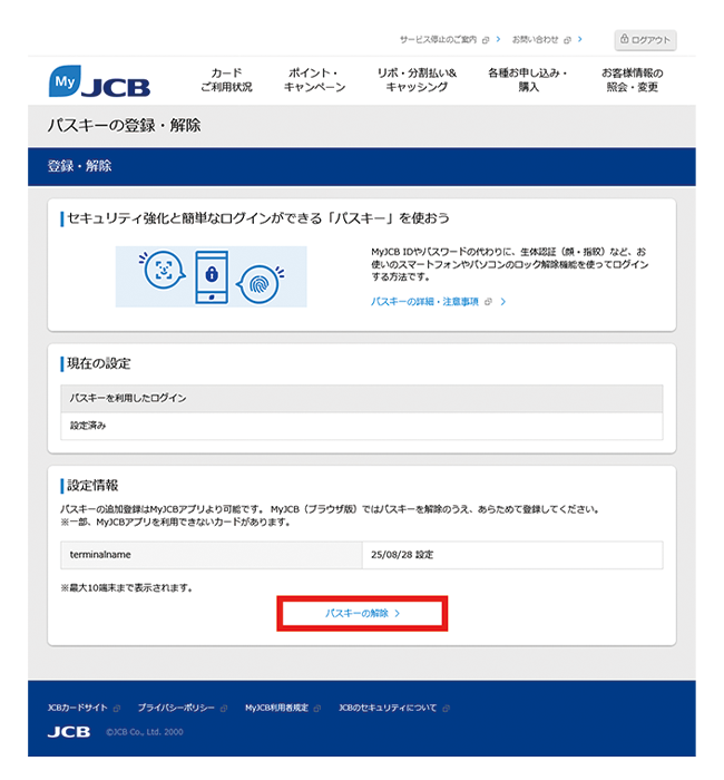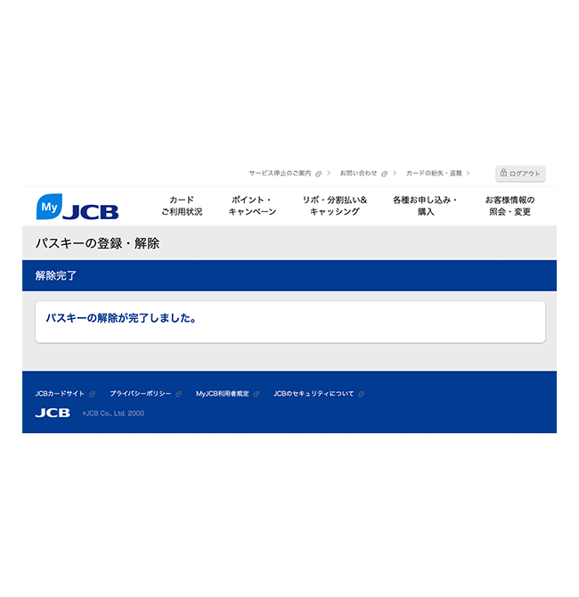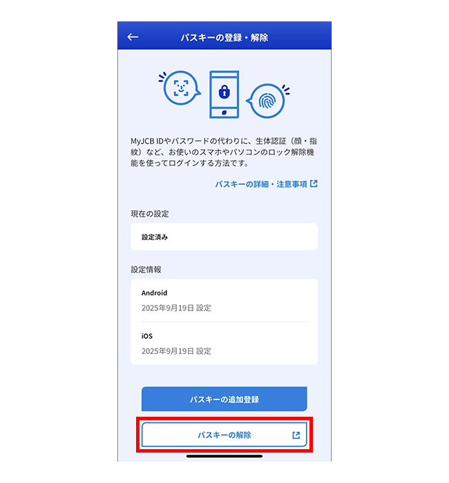 - MyJCBでパスキーを解除しても、お持ちの端末にはパスキーの情報が残ります。端末から情報を削除する方法は、お使いの端末のサポートページなどでご確認ください。