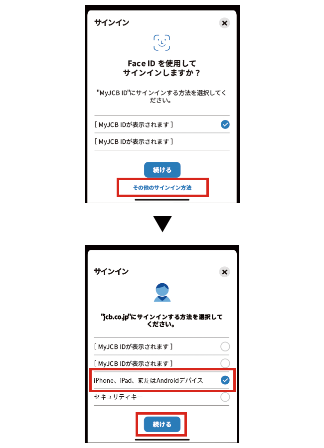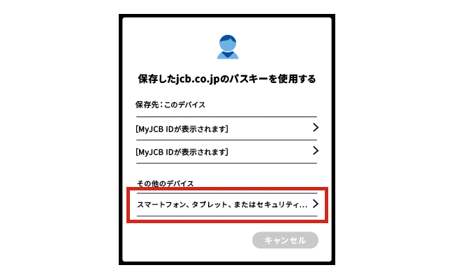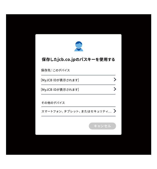 - 学校や勤務先、家族など、他の人が利用する端末にはパスキーを登録しないでください。他の人が端末のロックを解除できる場合、パスキーを設定しているMyJCB IDにログインできてしまう可能性があります。