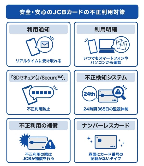 JCBカードは、カード情報の不正利用を防ぐため、不正検知システムを導入して24時間365日監視を行っています。不正利用発生の可能性が高いと判断した場合は、カード利用を一時停止し、電話・メール・SMS・アプリ通知・書面等の方法で連絡します。