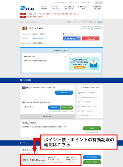 MyJCBにログイン後、トップページにてポイントを確認できます。