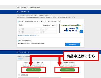 「ポイントサービスの照会・申込」画面の、「商品コース・ポイント数からの申込」または「商品番号からの申込」を押してください。