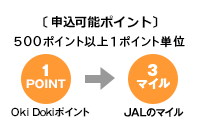 Oki Dokiポイント1ポイントをJALのマイル3マイルに移行できます。
