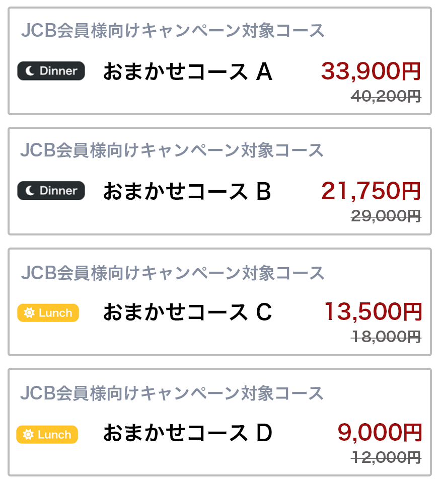 JCBプレミアム会員様限定で、100店以上の日本を代表するレストランを、通常よりもお得にご予約いただけます。