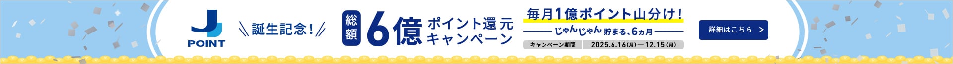 2025年6月16日(月)~ 2025年12月15日(月)の利用額に応じてJ-POINTを進呈するキャンペーンを実施中です!詳細はこちら。