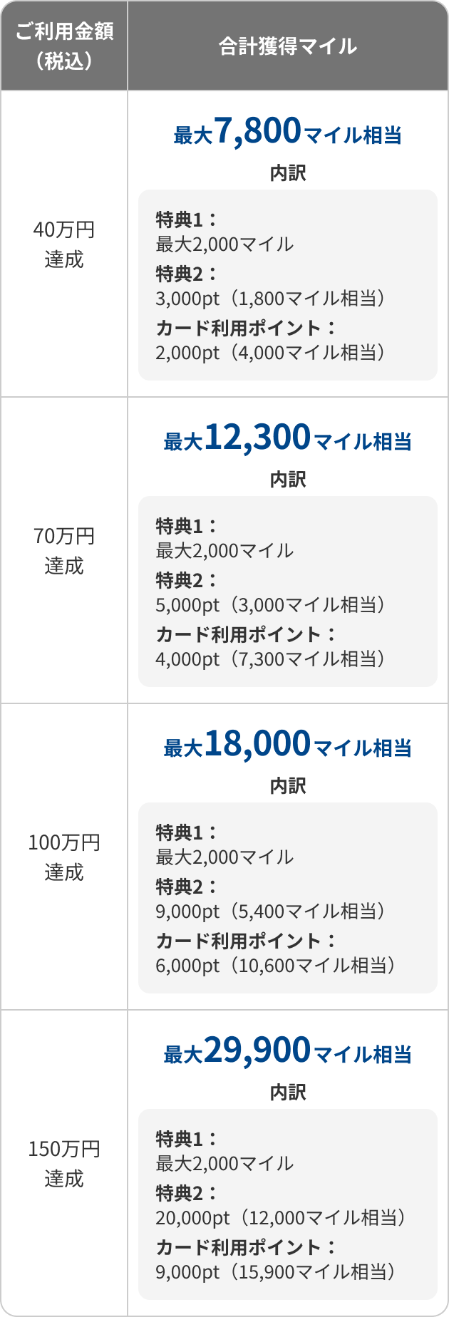 - 150万円(税込)ご利用時にたまる「通常ご利用ポイント」と「J-POINTボーナス」を、「2マイルコース」選択時にマイルへ移行・交換した場合です。