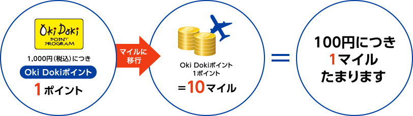 ※Oki Dokiポイントをマイルに移行・交換した場合です。還元率は交換商品により異なります。入会キャンペーンの特典は1Oki Dokiポイント=3マイルの交換レートの「ボーナスポイント」としてプレゼントします。