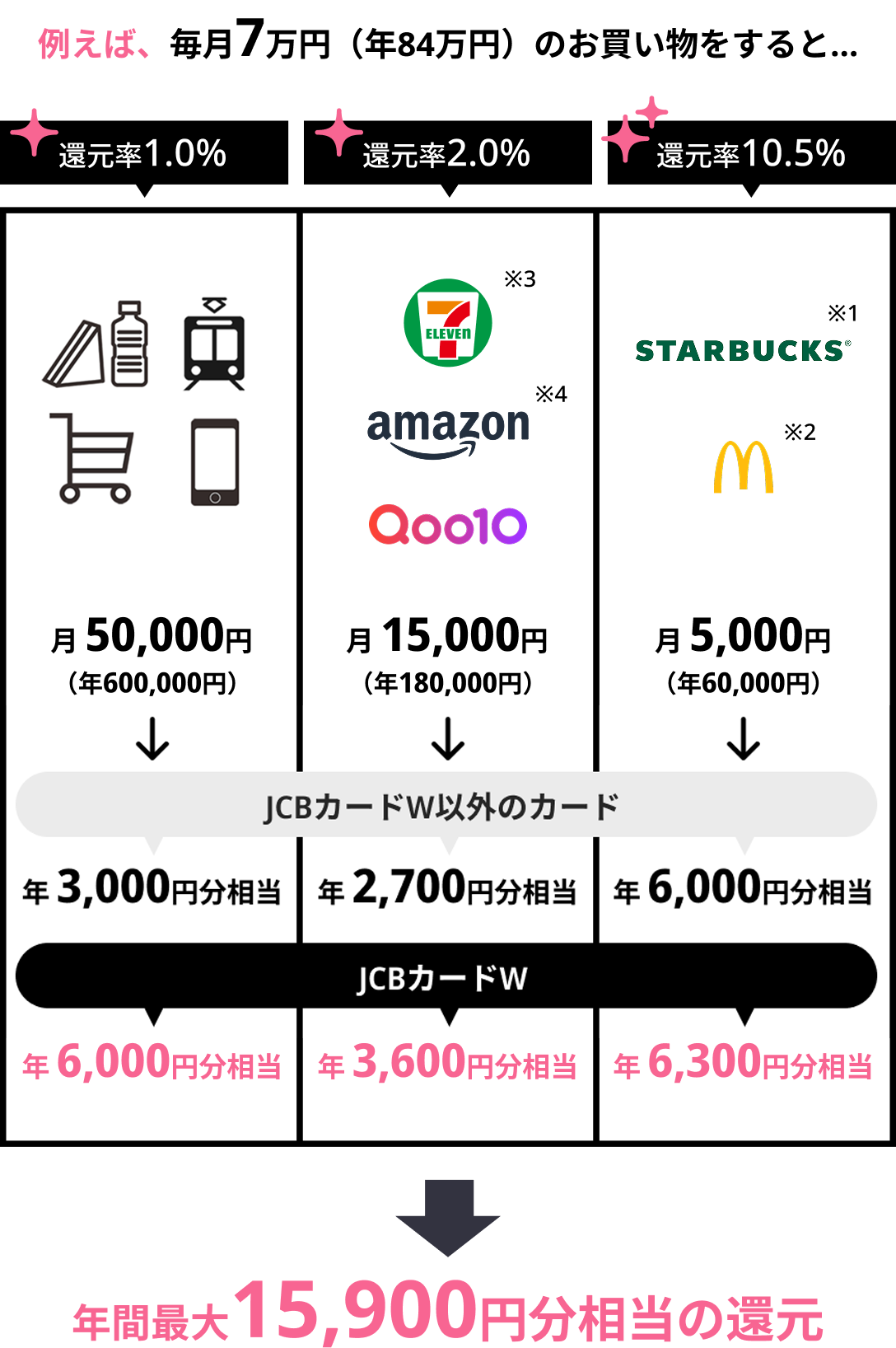 さらに、ポイントが通常のJCBカードの2倍、200円(税込)につき2ポイントたまります。さらにAmazon.co.jpやセブン‐イレブン、スターバックスなど対象店舗の利用で還元率がアップ!