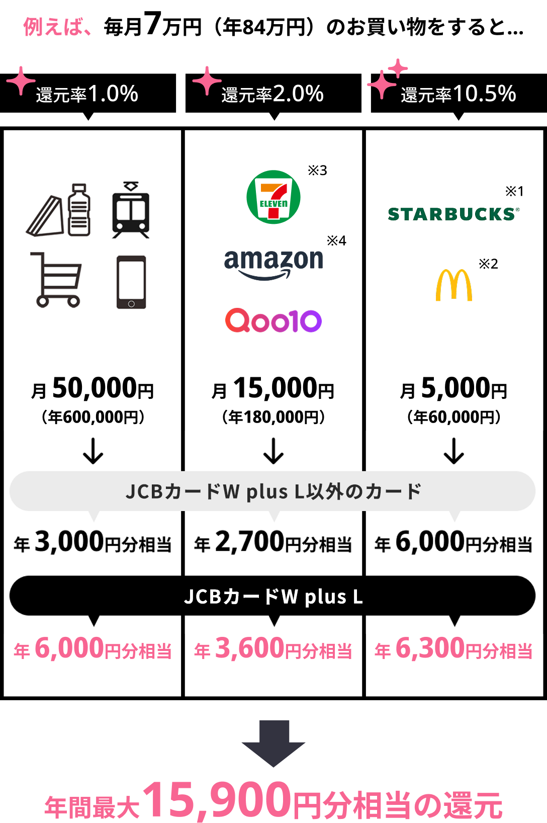 さらに、ポイントが通常のJCBカードの2倍、200円(税込)につき2ポイントたまります。さらにAmazon.co.jpやセブン‐イレブン、スターバックスなど対象店舗の利用で還元率がアップ!