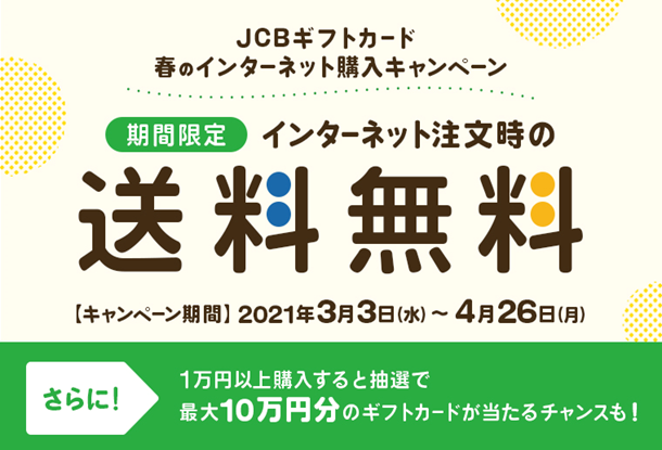 JCBギフトカードをインターネットで購入すると、440円(税込)/件の送料が無料です。さらに、1回の注文で1万円以上購入すると抽選でJCBギフトカードが当たるチャンスも!